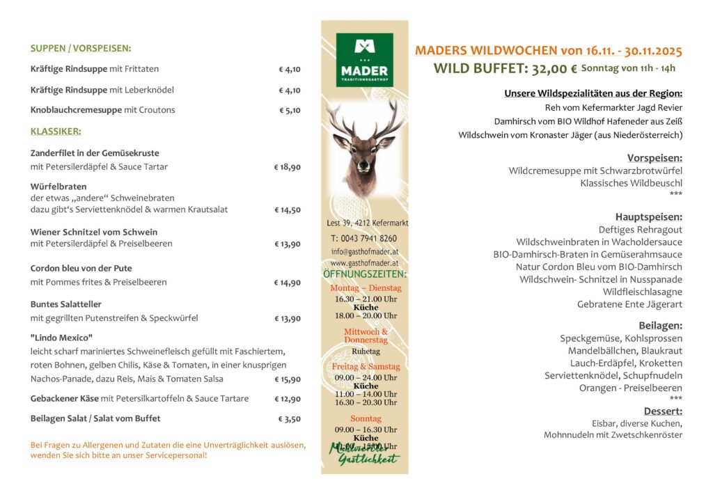 Liebe Gäste, ab Sonntag, 16. bis Sonntag 30. November 2025 starten wir mit unseren WILD WOCHEN! Unsere Wild kommt direkt aus der Umgebung von unseren Lokalen Lieferanten! Damhirsch vom BIO
